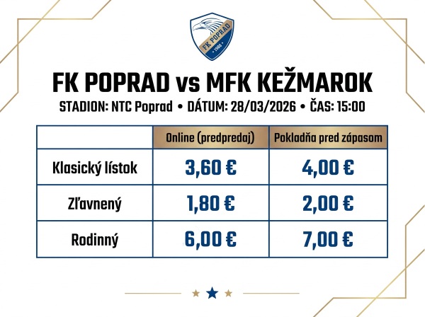Vstupenky je možné si zakúpiť v našom TICKETINGU FK POPRAD. V deň zápasu sa budú vstupenky predávať aj na pokladni v čase od 14:00 do 15.45 (t.j. do konca 1. polčasu).
