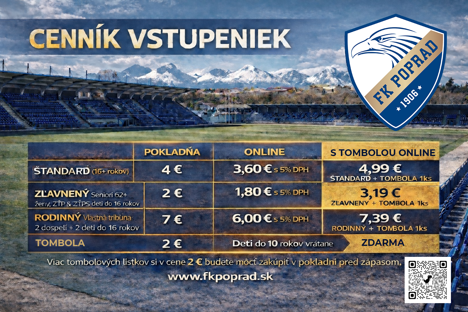 Vstupenky je možné si zakúpiť v našom TICKETINGU FK POPRAD. V deň zápasu sa budú vstupenky predávať aj na pokladni v čase od 14:00 do 15.45 (t.j. do konca 1. polčasu).