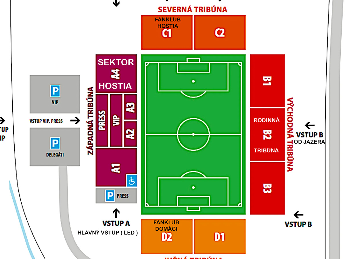 -Rodinná tribúna - vstup na tribúnu cez turniket B od jazera ( v prípade výpadku turniketu cez bránu B tribúny a usporiadateľa, ktorý naskenuje vstupenku manuiálne ) tlačená vstupenka cez vstup B cez usporiadateľa